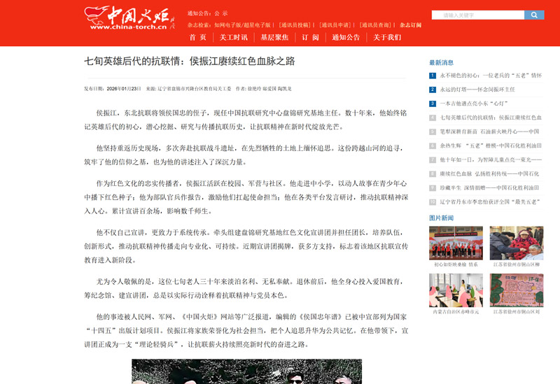 他的事迹被人民网、中国军网、《中国火炬》网站等广泛报道,编辑的《侯国忠年谱》已被中宣部列为国家“十四五”出版计划项目。侯振江将家族荣誉化为社会担当,把个人追思升华为公共记忆。在他带领下,宣讲团正成为一支“理论轻骑兵”,让抗联薪火持续照亮新时代的奋进之路。作者:徐艳玲 邸爱国 陶凯龙(来源:中国关工委 《中国火炬》杂志)